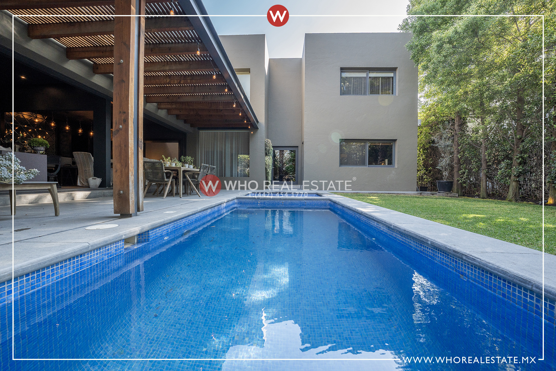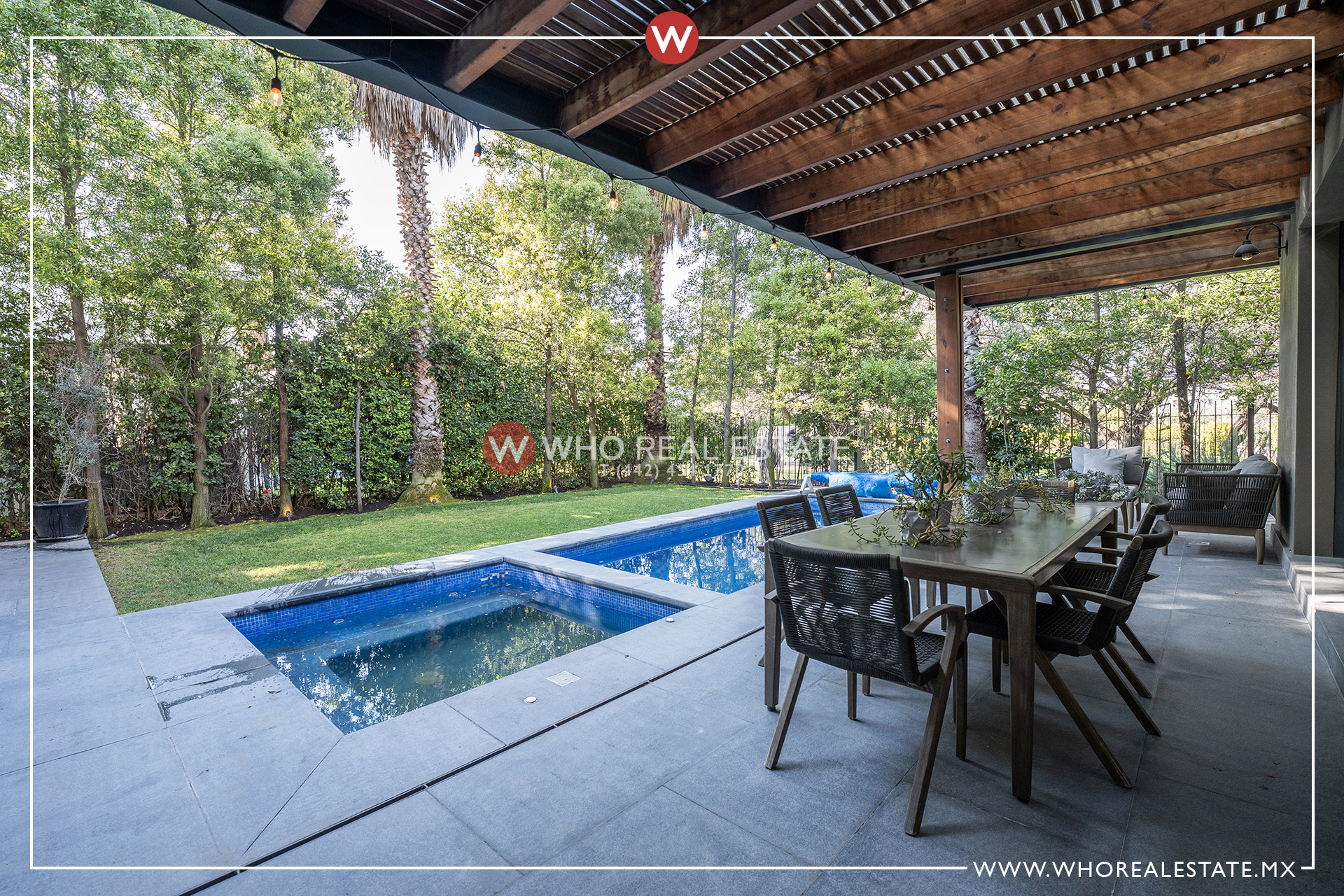 La alberca complementa el espacio exterior, creando un ambiente ideal para el descanso y la relajación.